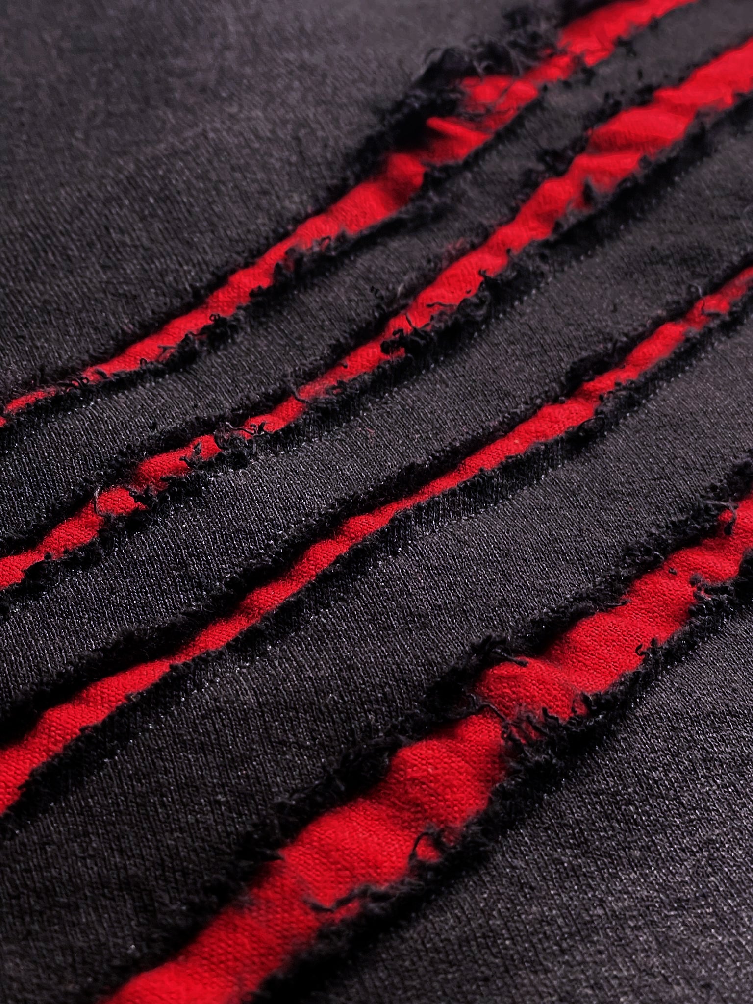 OVERSIZED FIT HOODIE WITH FREDDY KRUEGER GRAPHIC ON FRONT, ICONIC RED AND GREEN COLORED PARACORD HOODIE STRING AND CUT AND SEW CLAW MARKS ON BACK